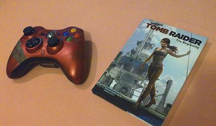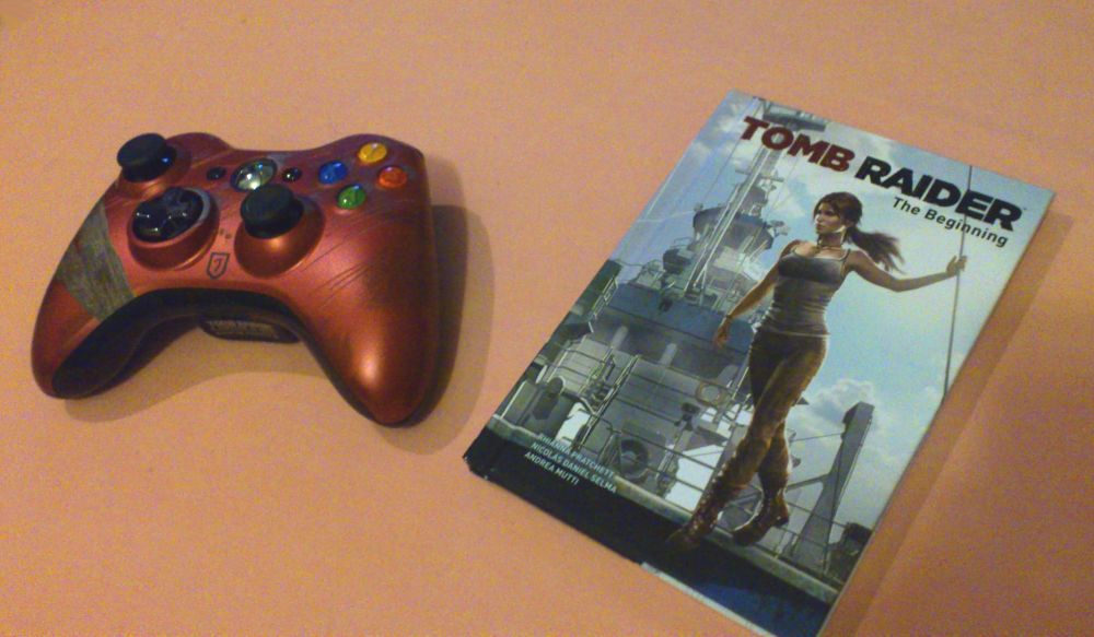 C'est 20h00, nous avons fini de jouer et il faut tout ranger. C’est Sacha et Catherine qui s’occupent de débrancher toutes les consoles et éteindre les écrans, pendant que nous les regardons faire. On se sent un peu mal à l’aise dans ces moments là, de ne pouvoir rien faire pour eux, haha. Sacha se rend ensuite au fond de la salle, dans une autre petite salle. Catherine le rejoint et ils reviennent avec... la manette Xbox 360 officielle de Tomb Raider !!! Ainsi que... "Tomb Raider – The Beginnings" la BD !!! Je croyais que c’était l’anniversaire de Lara, pas le notre !
