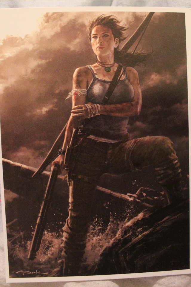 Nous faisons quelques photos de groupe avec Meagan et Sacha, puis Meagan nous donne des goodies (une lithographie limitée représentant la couverture du jeu, ainsi qu’une petite lithographie représentant le dessin de Andy Park pour les 15 ans de Tomb Raider).