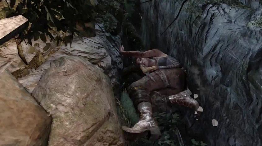 On voit ensuite au travers des yeux de Lara. Nous sommes dans la grotte, on peut voir les bougies et les morceaux de squelettes. On comprends que Lara se fait trainer par les pieds à cause de la manière dont la caméra avance. Elle ferme les yeux et les réouvre. La caméra pivote vers la droite, montrant la grotte à l’envers. Elle se fait hisser vers le haut (toujours vu à travers ses yeux), puis tout devient noir. Enfin, elle se réveille en inspirant soudainement et fortement, et se rend compte qu’elle est dans une espèce de cocon suspendue au dessus du vide. Elle crie les prénoms de ses amis, espérant qu’ils vont l’entendre. Et c’est là qu’on commence à jouer. Je vous passe les détails puisque vous connaissez sûrement déjà tous ce gameplay (voir la vidéo).